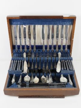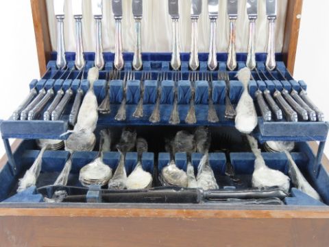 A large wooden canteen of silver plated cutlery for twelve sittings including carving set, one knife deficient.