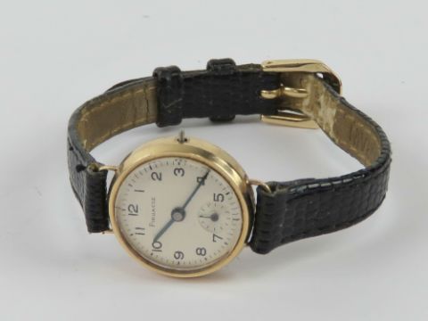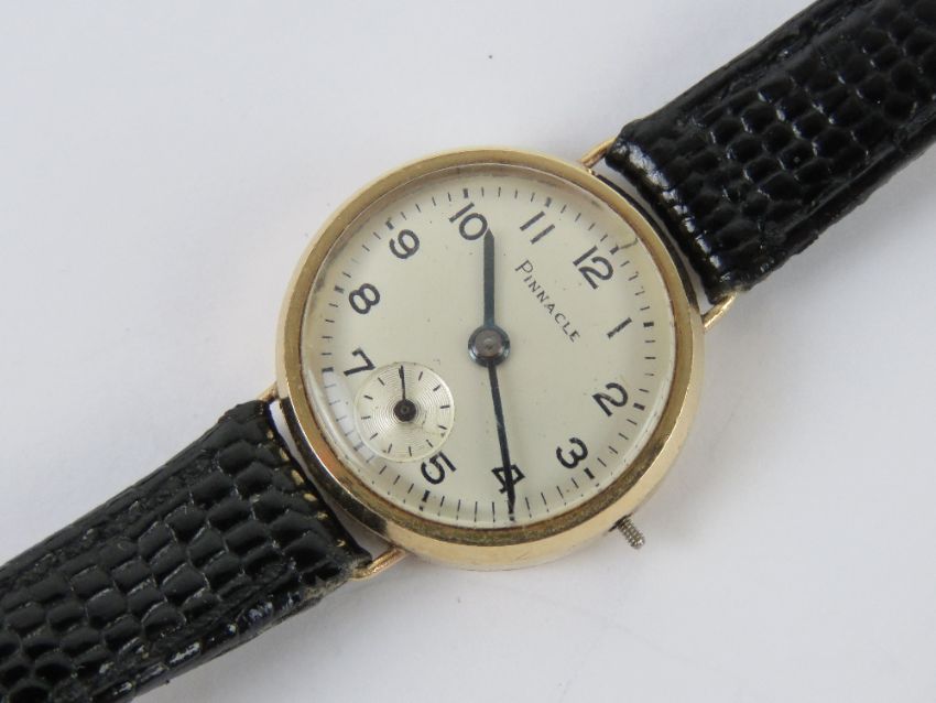 A 9ct gold ladies wrist watch having manual Pinnacle movement, crown wheel deficient, hallmarked 375, on black lizard skin strap.