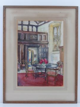 Watercolour sketch of a breakfast room featuring table with assortment of chairs with floral centrepiece, 35 x 24.5cm, framed and mounted.