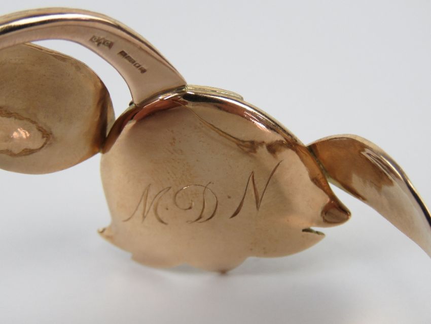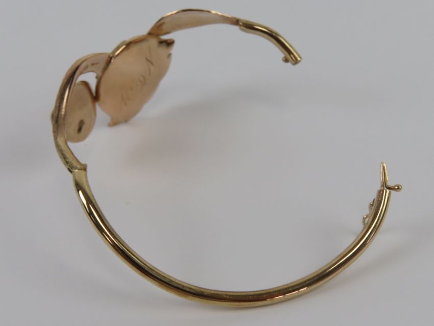 A bespoke 9ct rose gold hinged bangle having three dimensional rose and leaves upon, hallmarked London 2012, rose approx 3 x 2.5cm, approx internal diameter 6 x 5cm, being an individually commission piece, 25g. With valuation for insurance by The Goldsmithy for £1,850.