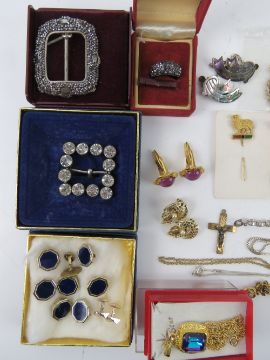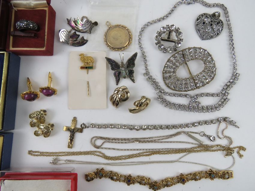 A quantity of assorted costume jewellery including a cut steel buckle, a pair of vintage Monet clip on earrings, Avon button covers, vintage claw set white stone necklace and bracelet, etc.