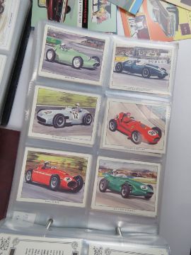 Three albums containing a large quantity of motoring and car themed photo cards, photos, collector cards, tea cards, cigarette cards, postcards, etc, etc.