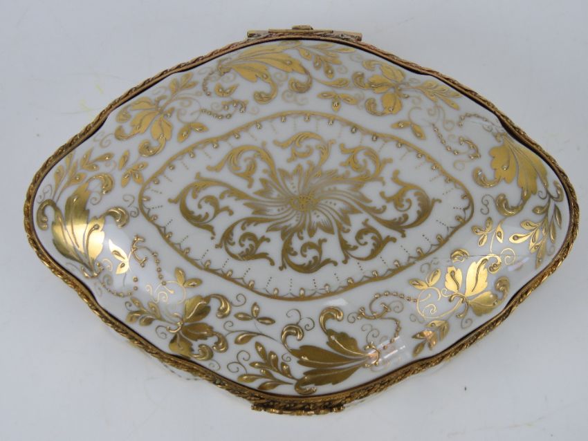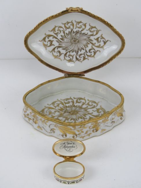 A Halcyon Days enamel trinket box '1981 A Year to Remember', together with a French dressing table porcelain trinket box having gilt decoration and measuring 18.5cm wide, a/f. Two items.