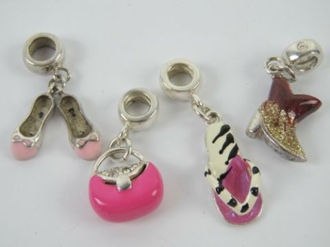 A set of four silver and enamel Pandora style charms, each stamped 925, in the form of a handbag, ballet slippers, flip flop and cowboy boot.