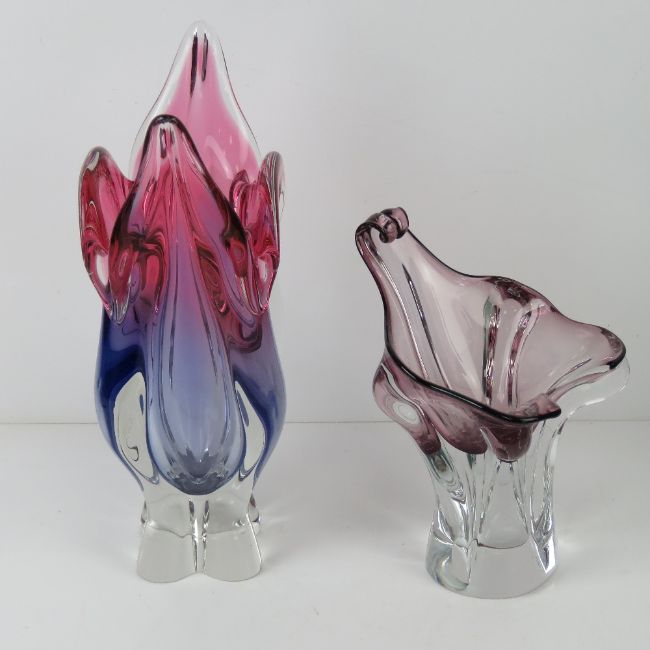 Two art glass vases, one in the form of a stylised calla lily standing 22.5cm high, the other standing 35cm high.