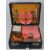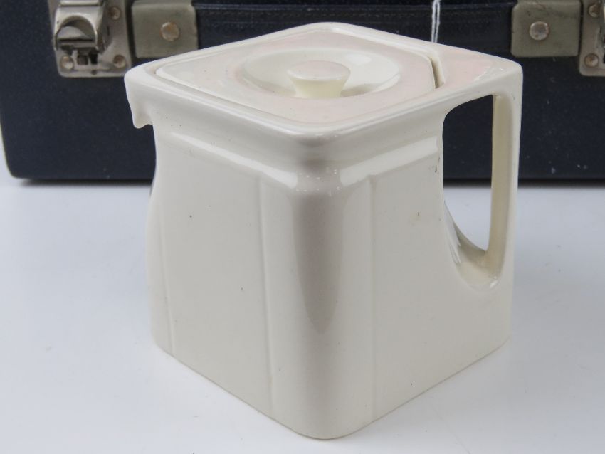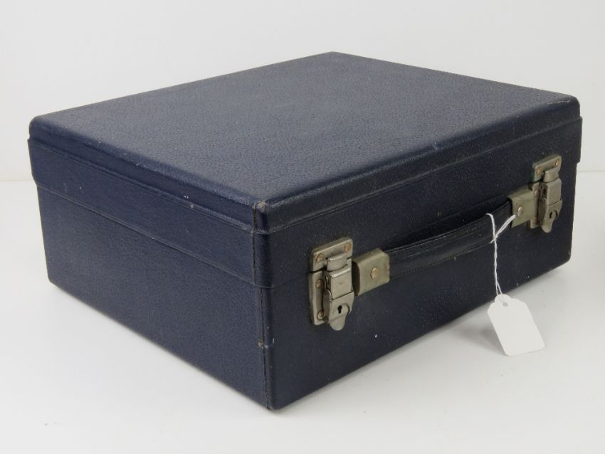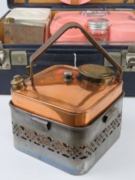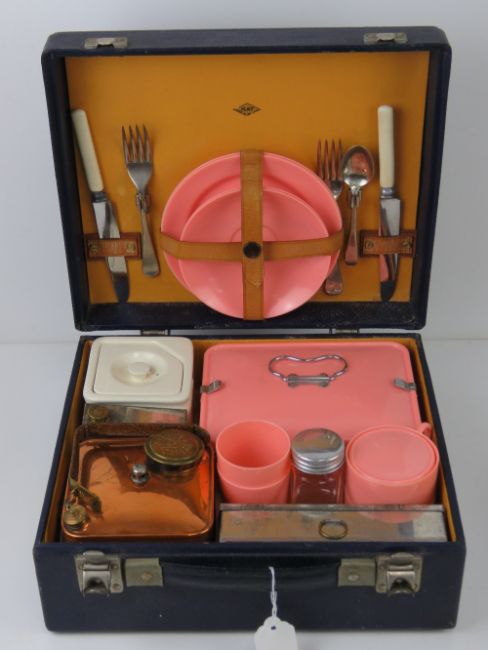 A vintage picnic case by Ilat with contents including beakers, teacups, storage boxes, plates, knives and forks, sandwich tin, flask, kettle and spirit burner.