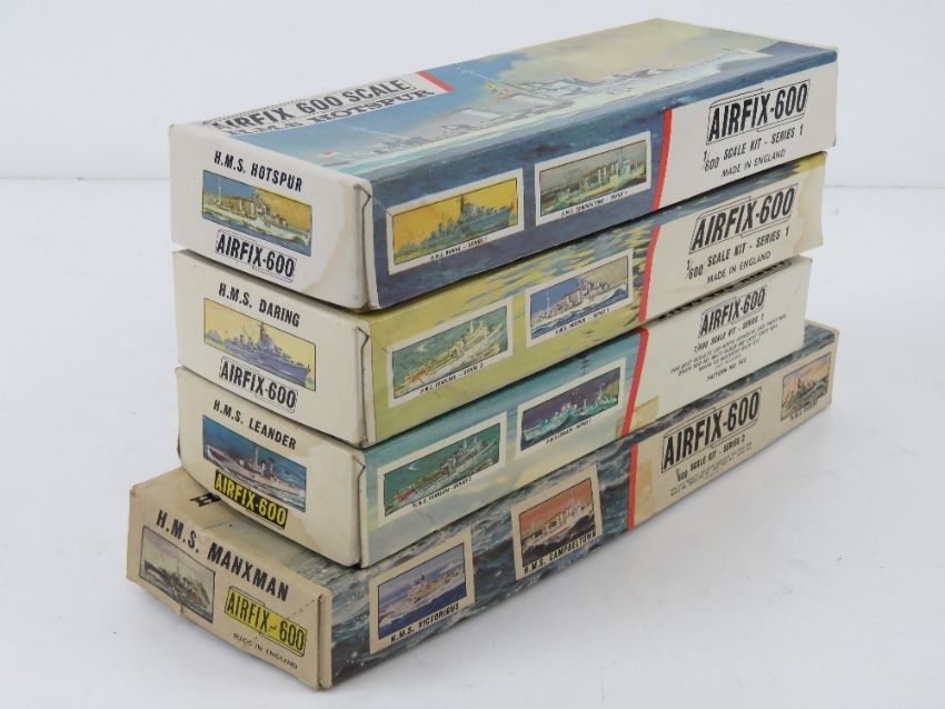 Four vintage Airfix-600 scale model ships inc three from Series 1 being HMS Leander, HMS Hotspur and HMS Daring, the other being Series 2 HMS Manxman.