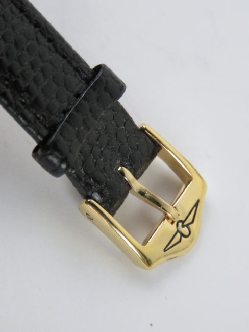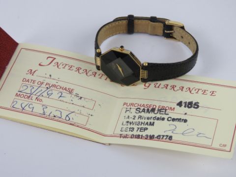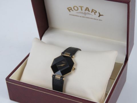 A ladies Rotary wristwatch with paperwork and box, faceted black octagonal dial on Rotary black leather strap.