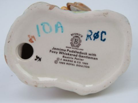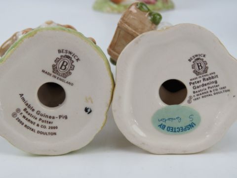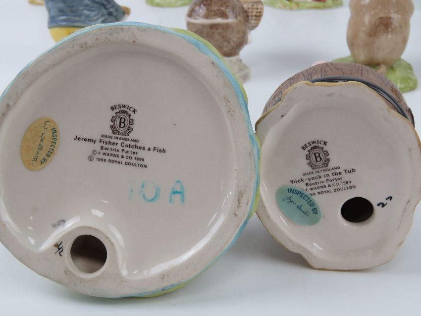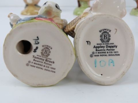 Beatrix Potter Beswick figurines each bearing B brown back stamp. Including; Peter Rabbit Gardening (having inspection label upon), Yock-yock in the tub (with inspection label upon), Tommy Brock, Timmy Willey Fetching Milk, Appley Dapply, Johnny Town-mouse eating corn (with inspection label), Tom Kitten (with inspection label upon), Amiable Guinea-pig, Jemima Puddleduck with Foxy Whiskered Gentleman, Peter in the Watering can, Jeremy Fisher catches a fish (with inspection label). Eleven items.