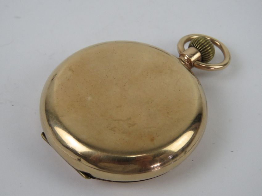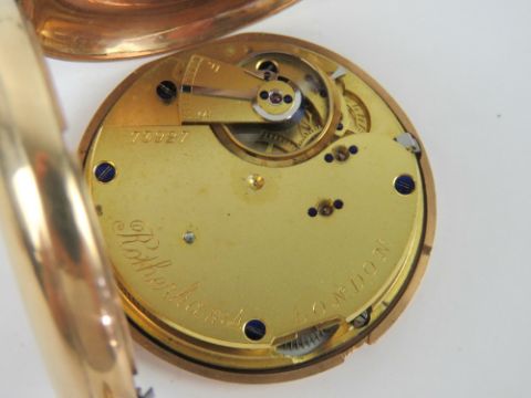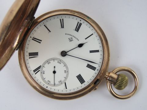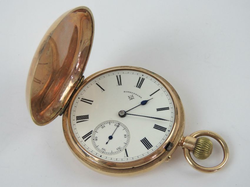 A 9ct gold full Hunter pocket watch marked to dial and movement for Rothererhams London no 73927, having white enamel dial with subsidiary seconds dial and blue steel hands, glass deficient, top wind, hallmarked for Birmingham to the case, 47mm dia, total weight 71g.