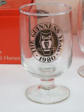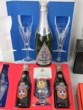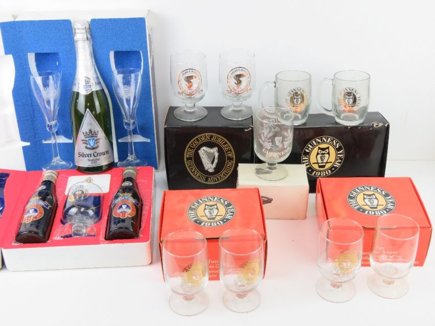 Guinness; commemorative set comprising two bottles of beer and goblet in original packaging together with four boxed pairs of Guinness glasses and one boxed single Guinness commemorative goblet. Also Stowells of Chelsea commemorative bottle of Silver Crown wine with pair of wine glasses. Seven items.