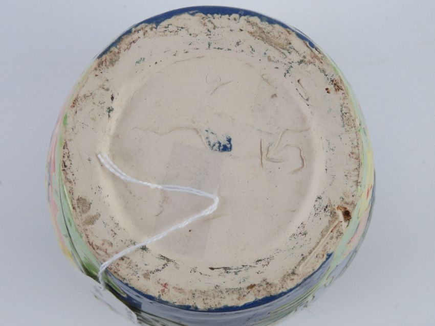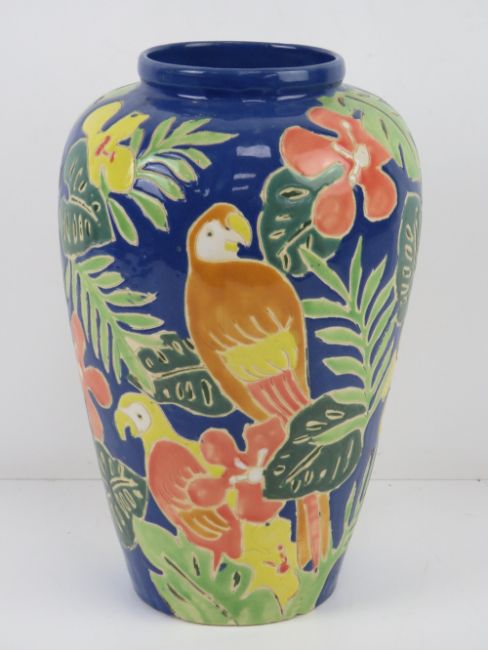 A glazed vase having tropical foliage and parrots upon, 27.5cm high.