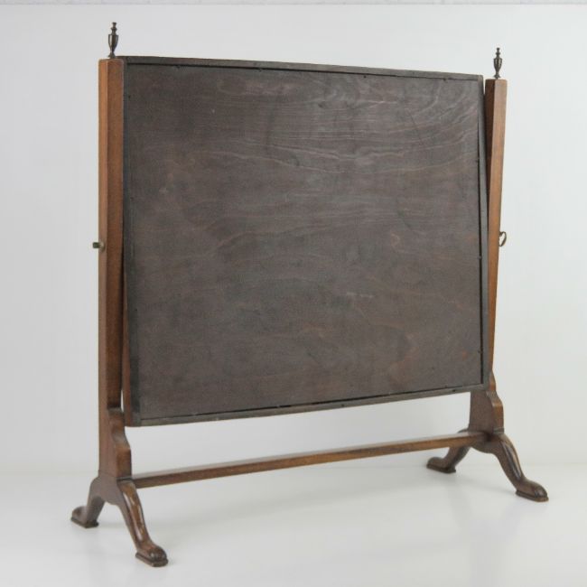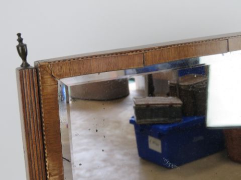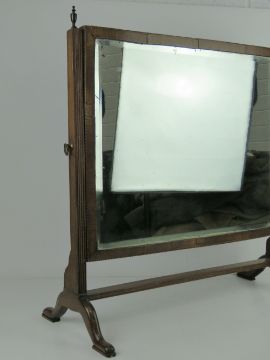 A bevelled edge Edwardian toilet mirror raised upon reeded supports terminating in outswept legs, brass finials, 59 x 62cm, slightly a/f.