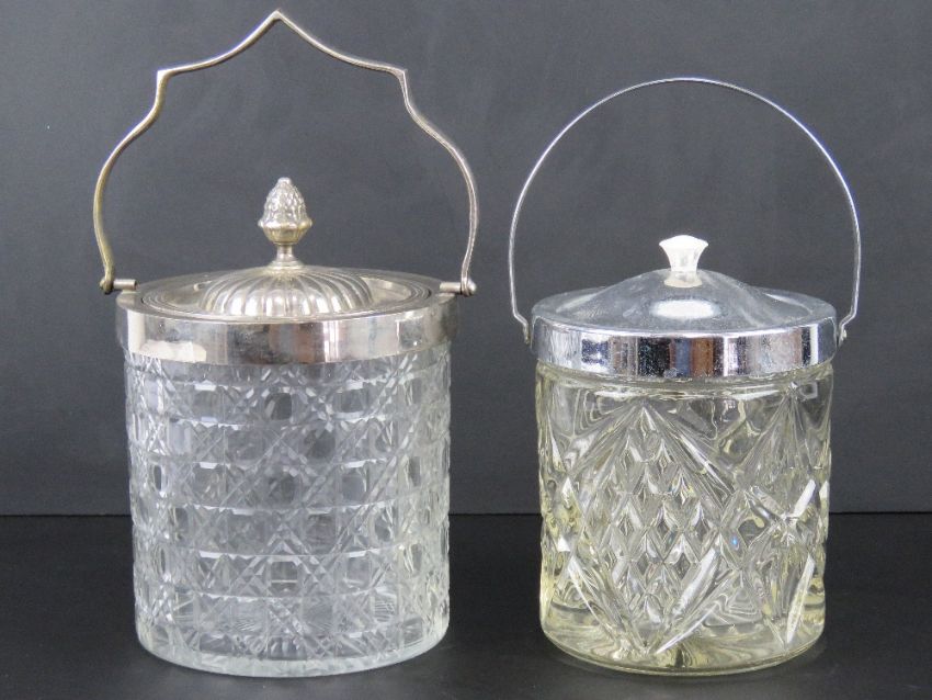 Two cut glass wafer / biscuit barrels, one with nickel plated lid and handle and one chromed.