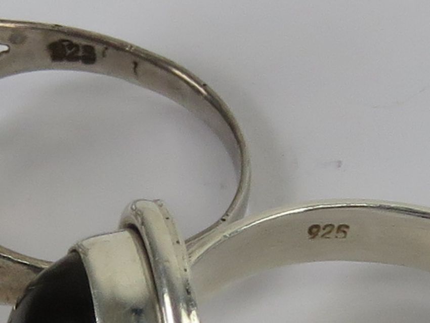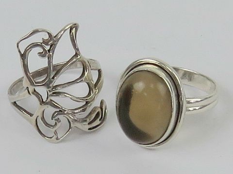 Two silver rings, one having open butterfly design, size R, the other having central cabachon, size S, each stamped 925.