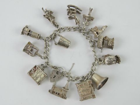 A HM silver charm bracelet with a quantity of large size charms upon including; miners lamp, Irish dancer, ballerina, wishing well, St Christopher figure, bell, church, bible, etc. Hallmarked to clasp and to chain link. 66.9g.