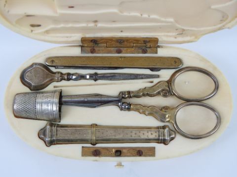 A 19th century French ivory etui sewing set, gilt metal, no apparent hallmarks, comprising scissors, needle case, knife, needle etc.