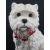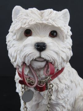 A figurine of a Westie with collar holding its leash in mouth, 23.5cm high.