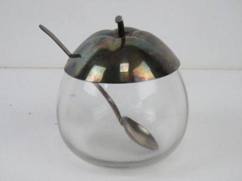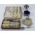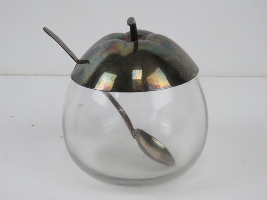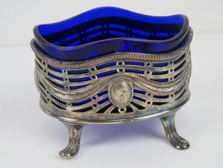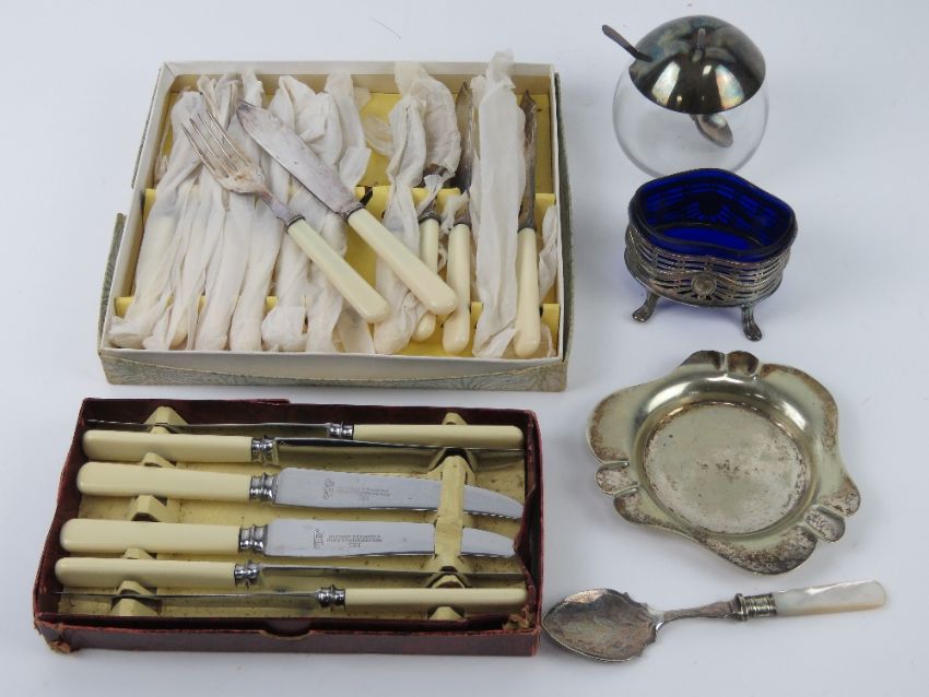 A silver plated salt having Bristol blue glass liner, together with a glass and silver plate conserve pot, a set of Wostenholm knives, a set of fish knives and forks, etc.