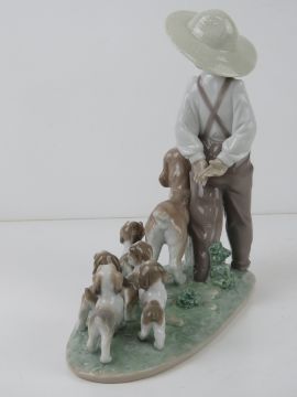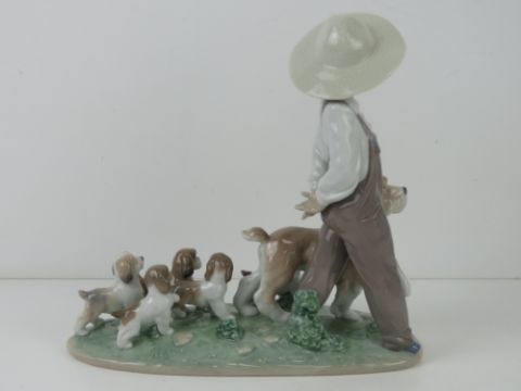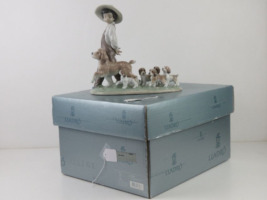 Lladro figurine 6828 'My Little Explorers' a boy walking with dog and five puppies following behind, with box, 26.5cm wide.