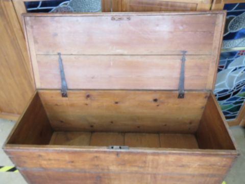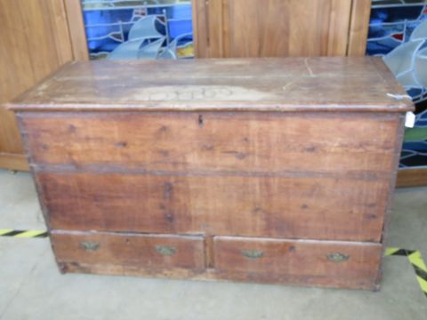 A plank-top pine mule chest, lid lifting to reveal compartment within. Two drawers under, 126 x 51 x 73cm.