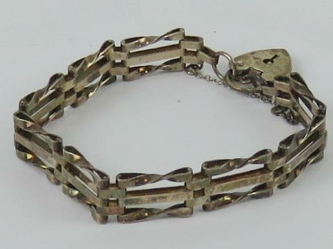 A silver three-bar gate link bracelet having London hallmark to heart padlock clasp, 10.1g.