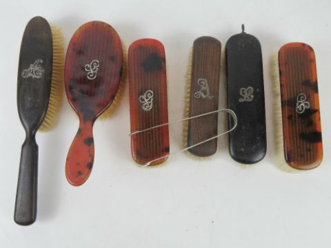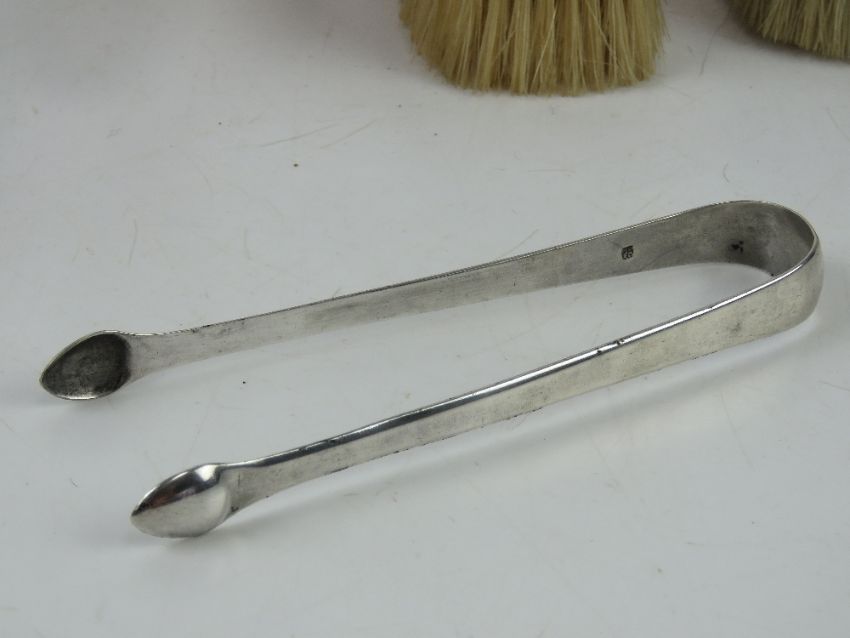 A pair of silver sugar tongs hallmarked (1876? slightly indistinct) together with a quantity of brushes having white metal initials upon.