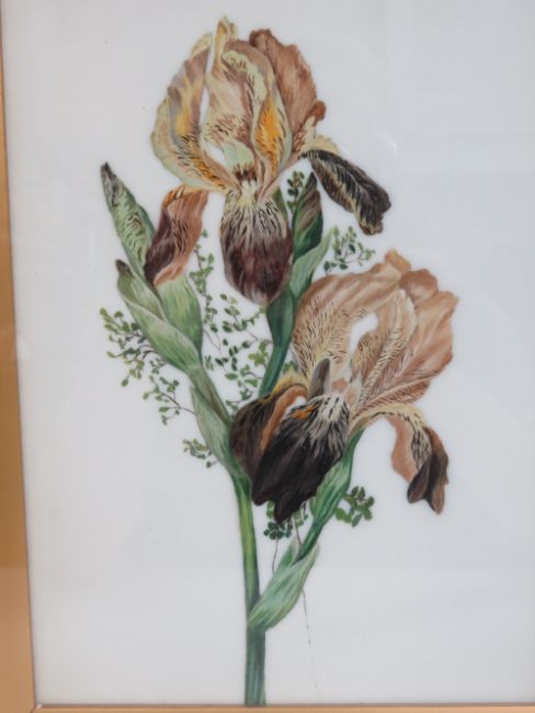 Glass painting; a delicately hand painted orchid on opaque milk glass panel, within recessed gilded frame, a/f, 24 x 17cm.