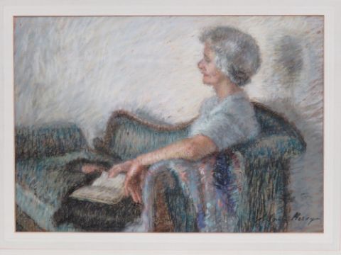 Pastel; a study of a recumbent lady reading upon a chaise longe entitled Eileen, signed Sonis Mervyn, P.S., S.W.A. this picture was exhibited at the pastel society Royal Institute Galleries and bears Pastel Society label verso, framed and mounted, 37 x 53cm.