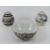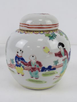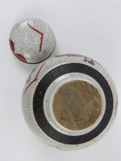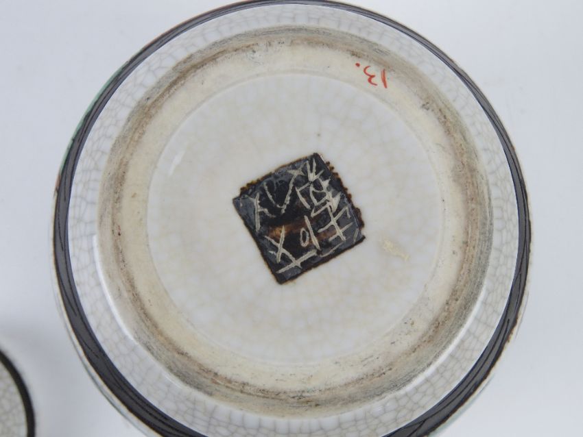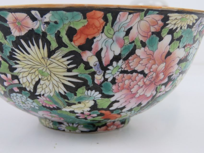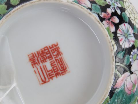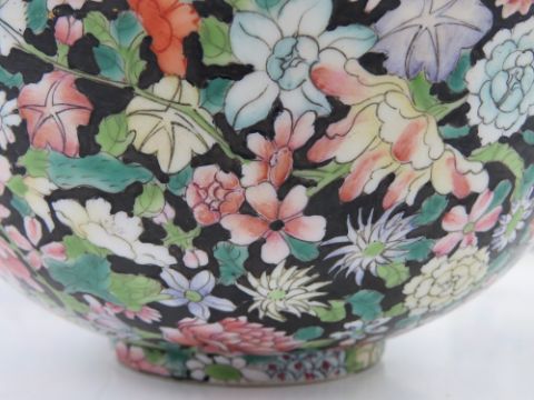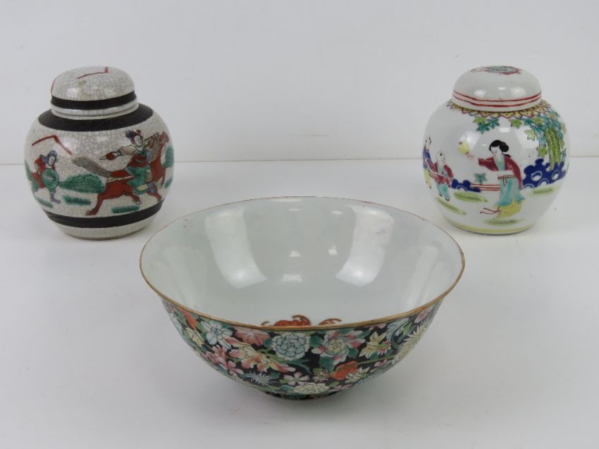 An Oriental bowl having black ground with pink and green floral design upon, character mark to base, 17cm dia, together with two lidded ginger jars, one having cork stopper. Three items.