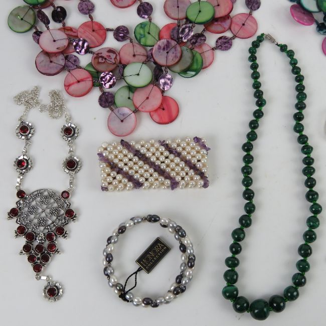 A quantity of assorted jewellery including shell necklaces, Honora pearl bracelets, malachite bead necklace, etc.