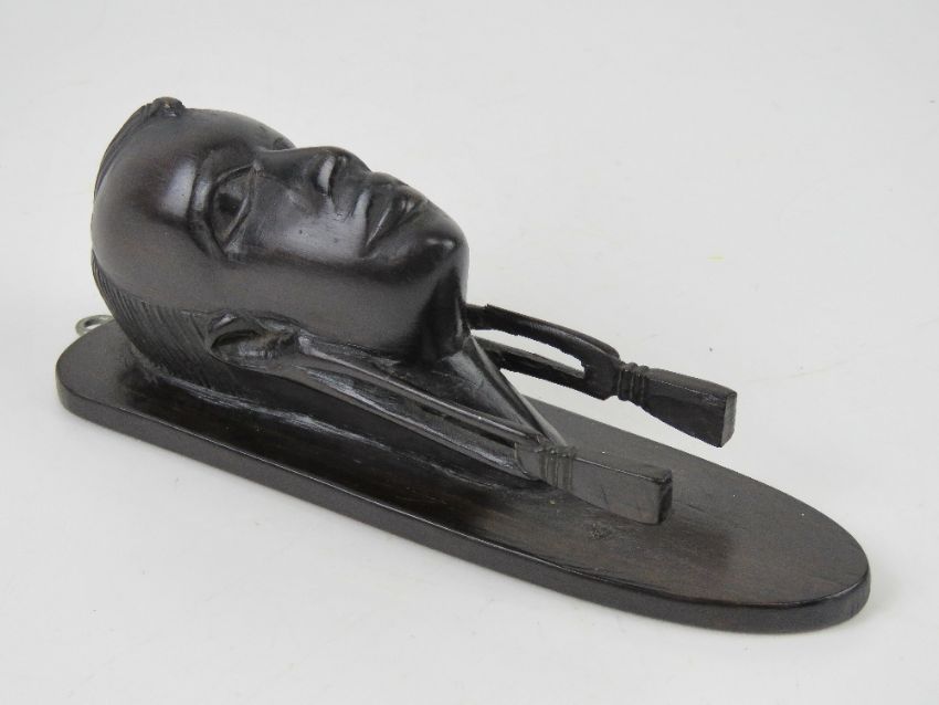 A carved African hardwood figurine of a woman standing 31cm high, together with a carved wooden wall plaque of a person with elongated ear lobes. Two items.