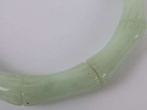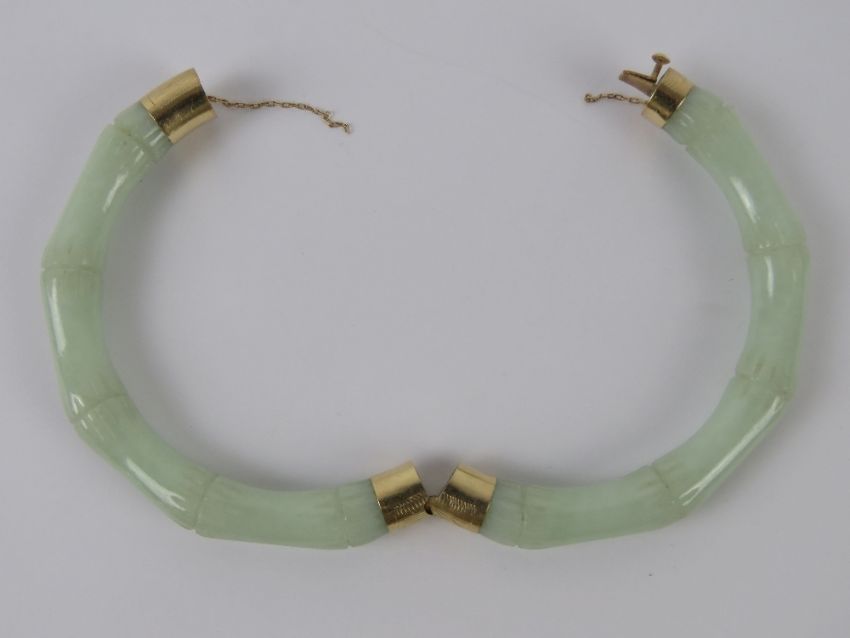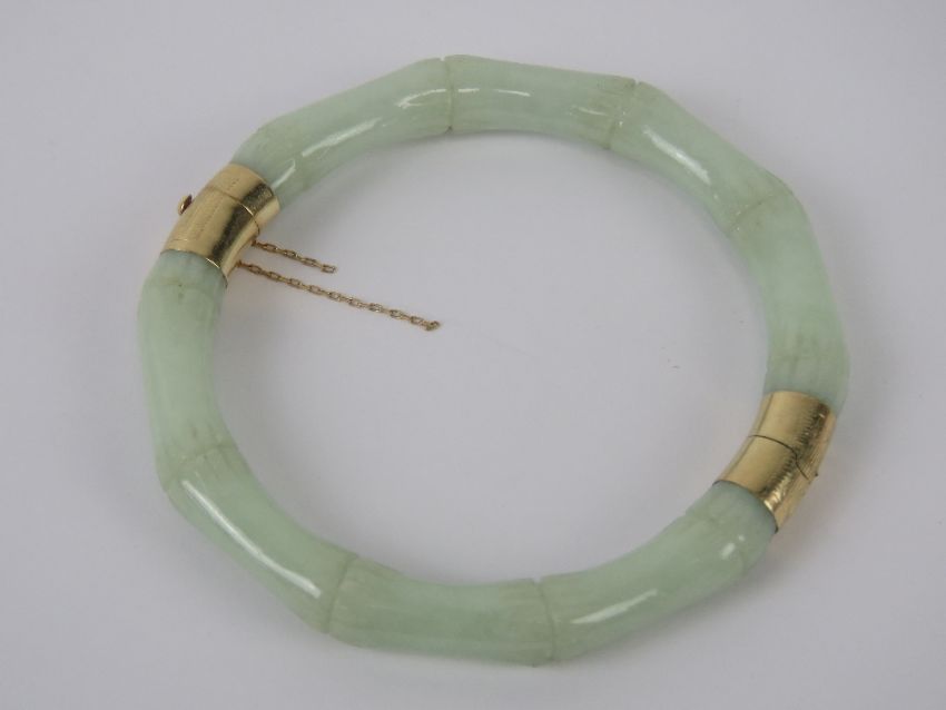 A 14ct gold and jade bangle, the pale opaque green jade carved into a bamboo pattern, the clasp stamped 14k 585 with 585 hallmark over, approx internal dia 6.2cm, approx external dia 8.8cm, 44g.