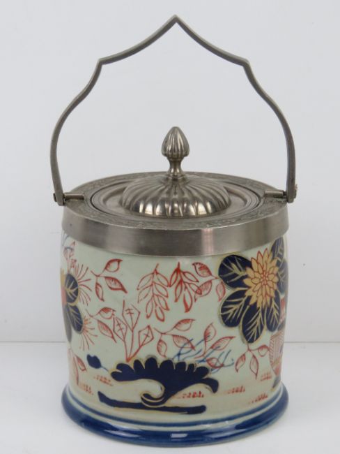 A good Ironstone Imari pattern wafer / biscuit barrel with nickel plated lid and handle.