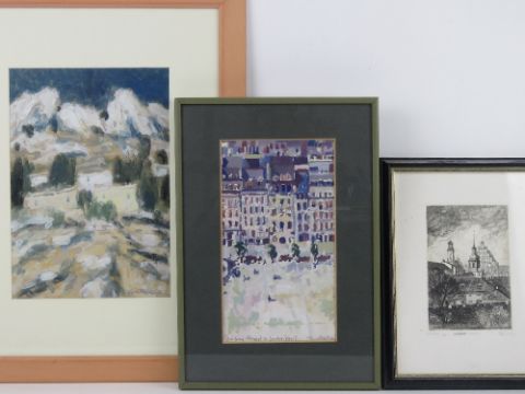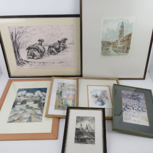 A quantity of assorted prints, some signed by the artist, also some impressionist paintings, all in frames. Seven items.