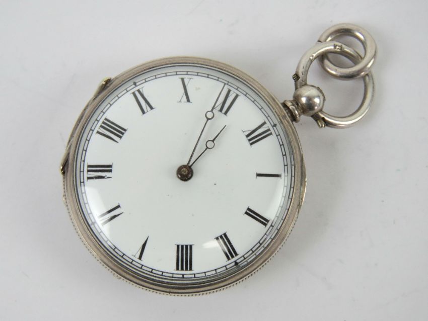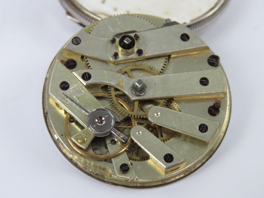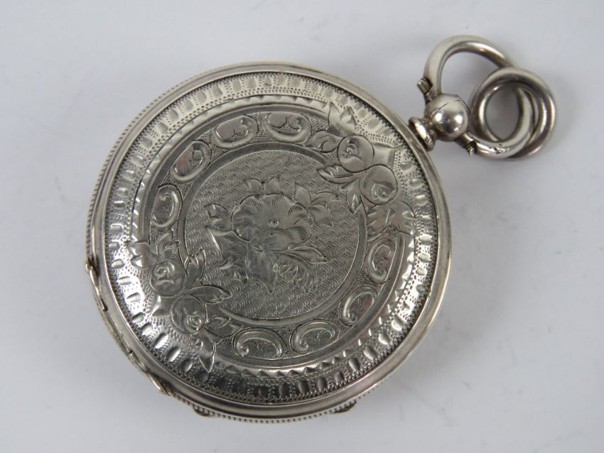 A silver open face key wind fob watch, slightly a/f, marked fine silver to case, approx 36mm diameter. Total weight 38g.