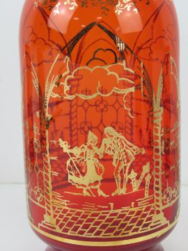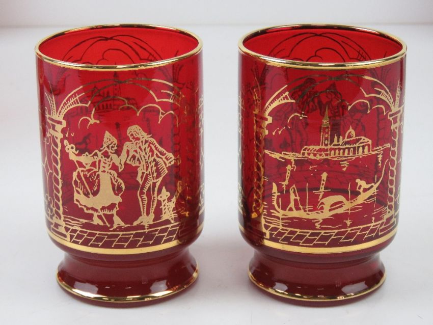 A Venetian ruby glass decanter set having six glasses, all having gilded scene and decoration upon, possibly Murano, decanter standing 37cm high.