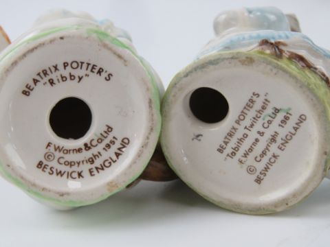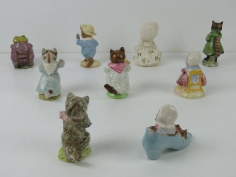 Beatrix Potter Beswick figurines each having brown back stamp. Including; Simpkin, The Old Woman Who Lived in a Shoe knitting, Ribby, Tabitha Twitchett, Miss Moppet, The Old Woman Who Lived in a Shoe, Tom Kitten & Butterfly, Mr Jackson & Lady Mouse. Nine items.