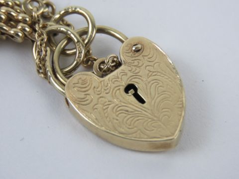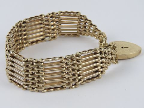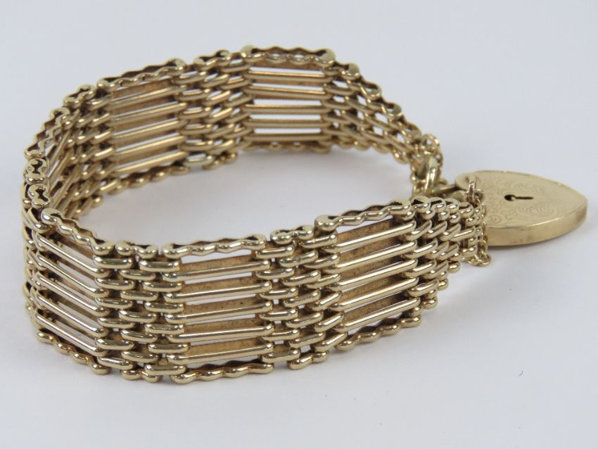 A fine substantial 9ct gold 7-bar bracelet having heart padlock clasp, hallmarked to bracelet and clasp approx 19cm in length, 33.6g.