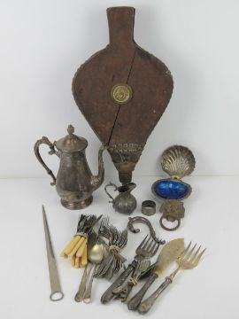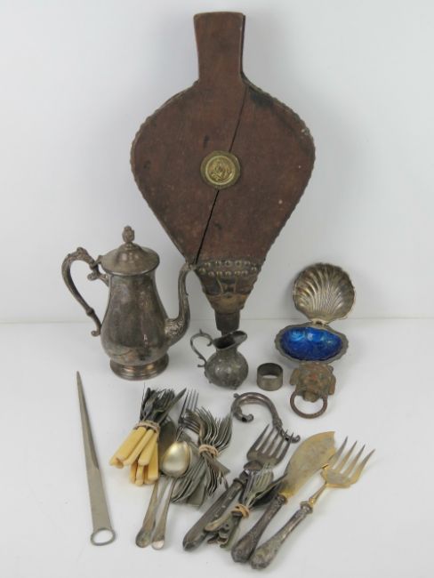 A quantity of assorted silver plated wares including; meat skewer, fish servers, clam shell style condiment dish, coffee pot etc, also a pair of wooden and leather fire bellows.