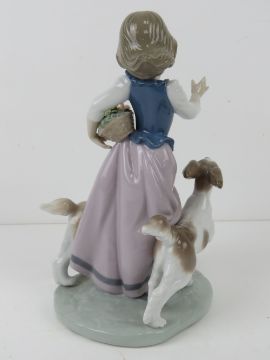 Lladro figurine 5761 'Out For A Romp' a girl with two dogs and a basket of flowers under her arm, with box, 22cm high.