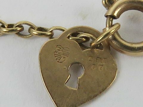 A 9ct gold chain bracelet with heart padlock charm upon, hallmarked 375, 19cm in length, 1.3g.