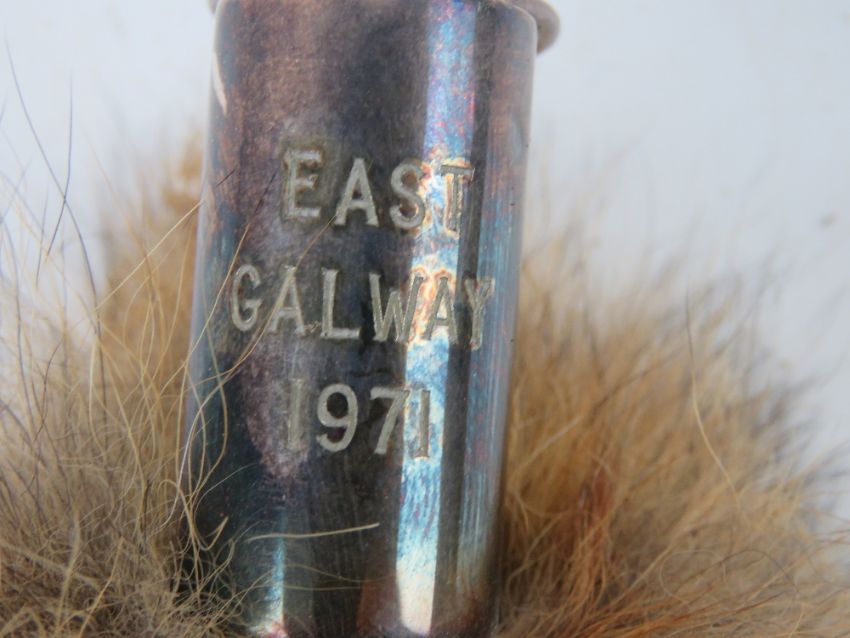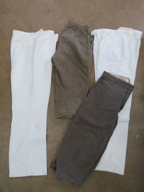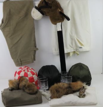 A quantity of assorted sporting items including; white sporting trousers, two pairs of 'Shootin Breeks' green britches, fox brushes, a ceramic salt cellar in the form of a wren by Quail, a set of four Coal and Mason picnic wine glasses, a musical Hobby Horse, and three contemporary riding helmets.