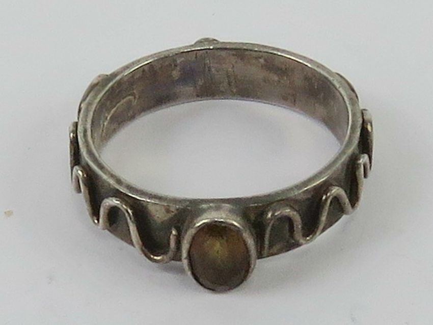 A HM silver ring in Arts and Crafts style having oval orange coloured stone to centre and raised wave pattern throughout, hallmarked Birmingham, size Q-R.