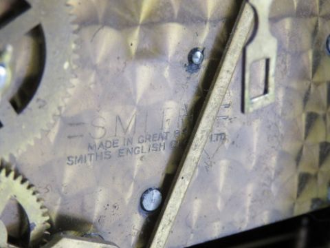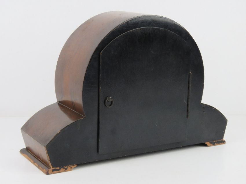 A three train striking over mantle clock, c1950s mahogany case, allied Arabic numerals, striking on gongs, 34cm wide.