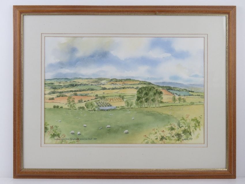 Watercolour by Kathlean Ellis 'Campdon Church from Ebrington Hill above cave bank 1997', sheep in field before, hills and sky beyond, 51 x 33.5cm, framed and mounted.