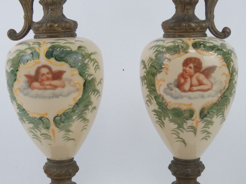 A pair of decorative ceramic 'ewers' having transfer printed cherubs upon and further hand painted decoration, one a/f, each standing 41.5cm high.