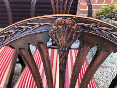 A good set of eight (6 + 2) mahogany dining chairs, all hoop-backed with part-carved decoration and newly-upholstered drop in seats.