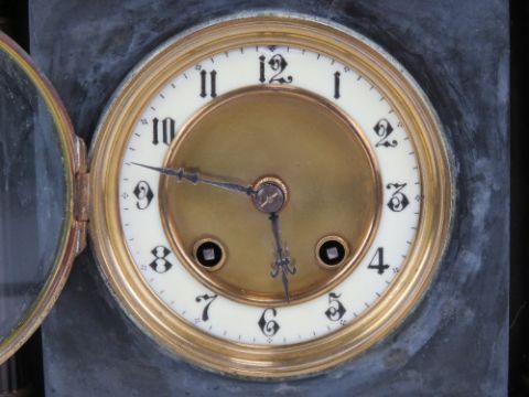 A late Victorian architectural slate mantle clock, enamelled chapter ring with Arabic numerals all before the eight day striking movement, 34cm wide.