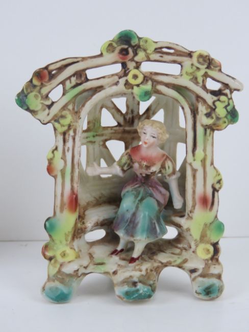 A pair of lattice ware ceramic figural garden floral encrusted seats with boy and girl upon, each 12cm high.